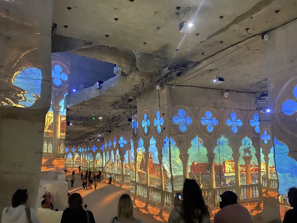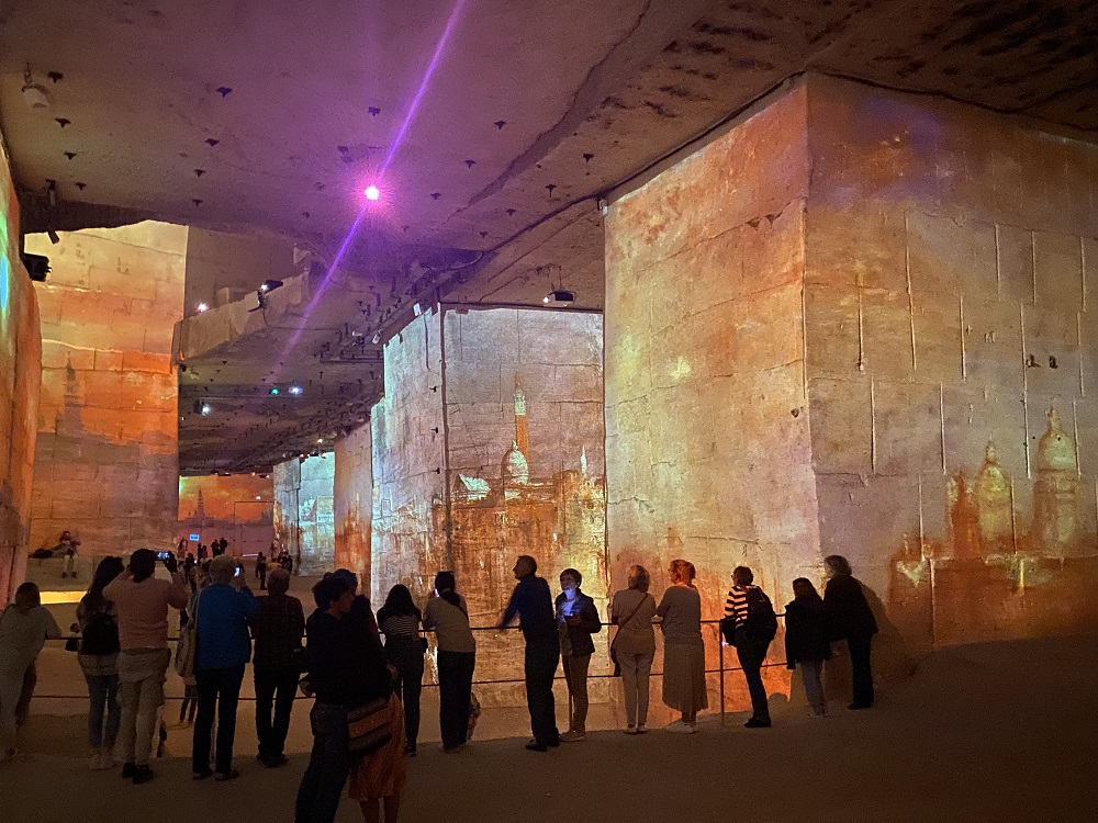 Après avoir déjeuné à Fontvieille, chez Alphonse Daudet (un très bon aïoli), nous allons jusqu’aux Baux dans les Carrières de Lumières. Au cœur d’une ancienne carrière réputée pour la découpe facile et la blancheur des blocs calcaires, nous sommes immergés dans les tableaux, les couleurs, la musique. Nous marchons dans Venise la Sérénissime avec les tableaux de Canaletto, de Carpaccio, du Tintoret et de Véronèse, jusqu’à la Mostra. Et nous plongeons ensuite au cœur de l’œuvre d’Yves Klein, au-delà de son célèbre bleu.