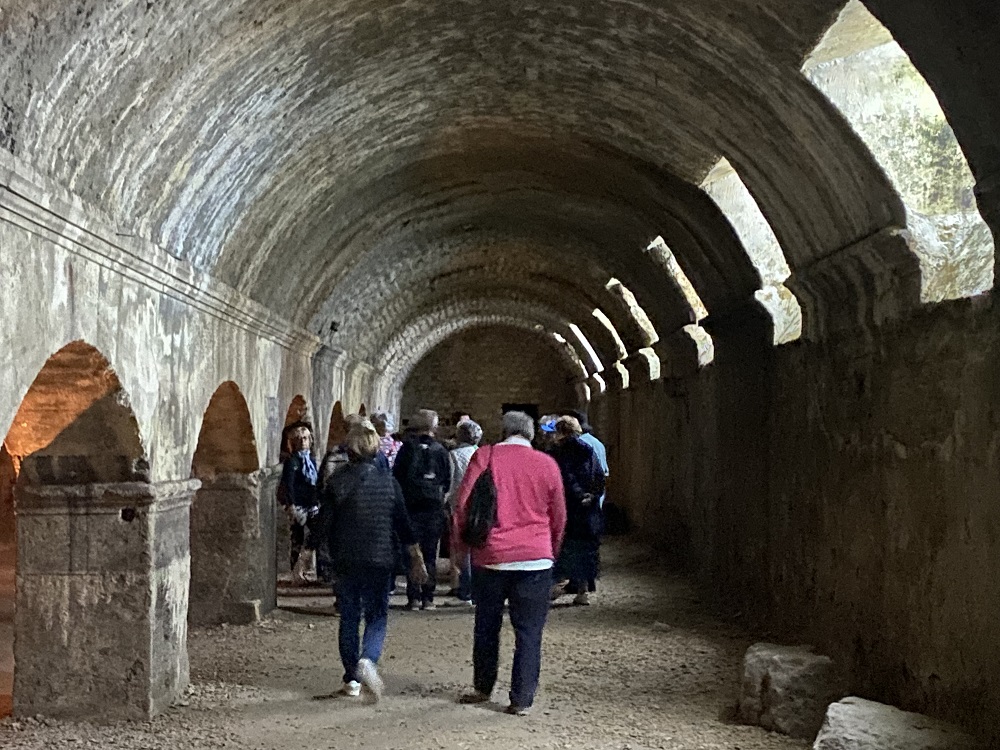 Puis, nous traversons des ruelles étroites et ombragées pour arriver place de la République. Là, nous descendons au sous-sol de la mairie pour voir les cryptoportiques. C’est un ensemble de trois galeries souterraines qui forment un U. Chaque galerie est dédoublée par une rangée de piliers massifs. Cette infrastructure était destinée à soutenir le forum tout en rattrapant la déclivité du sol. Au 8e siècle, ces galeries servirent de silos à grains et d’entrepôts.