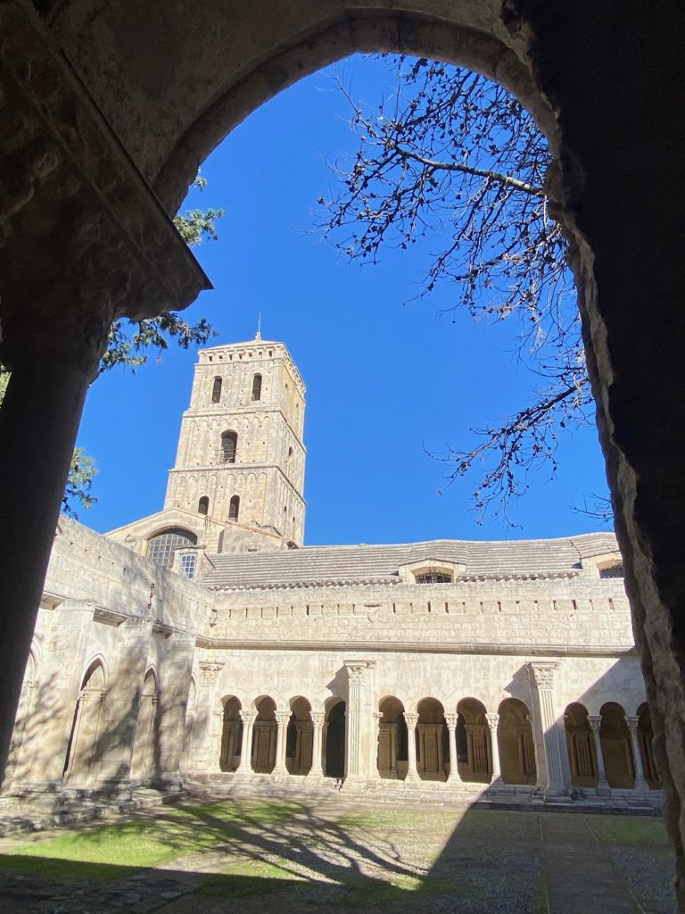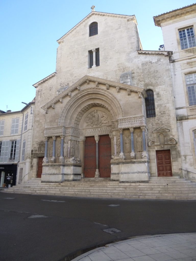 Nous remontons à l’air libre et traversons la place pour nous arrêter devant la cathédrale Saint-Trophime. Le portail du 12ème est un des fleurons de l’art roman provençal. Il a pour thème le Jugement Dernier. Le tympan en forme d’arc de triomphe représente le Christ roi entouré des symboles des 4 évangélistes. Nous faisons ensuite le tour du cloître : les galeries nord et est sont construites dans le style roman provençal du 12ème et les galeries ouest et sud furent achevées au 14ème dans le style gothique. Ce cloître était destiné aux chanoines de Saint-Trophime qui furent les artisans du redressement du pays après les invasions barbares.