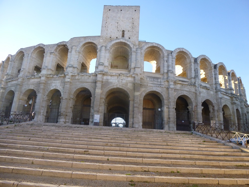 Enfin, nous longeons le quai de la Fontaine bordé de beaux hôtels particuliers le long d’un canal ombragé de micocouliers. Mais il était 18 heures, et le temps d’arriver aux Jardins de la Fontaine, ils étaient fermés ! Nous n’avons donc pas pu voir la tour Magne et nous quittons Nîmes pour Arles où, le soir, on nous sert à dîner… du poulet (nettement moins bon qu’à midi !).